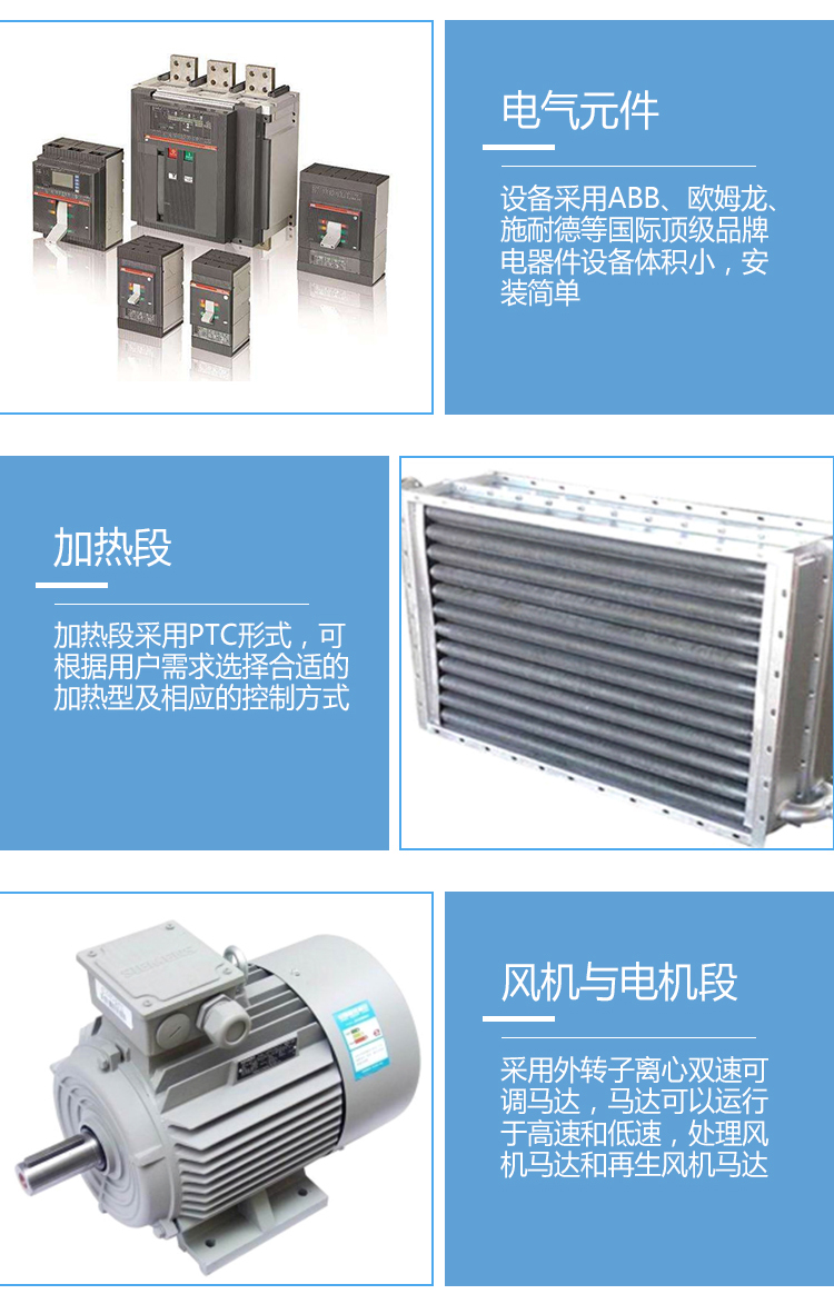 11、設(shè)備采用ABB、OMR ON (歐姆龍)、Schneider(施耐德)等國際頂級品牌電器件設(shè)備體積小,安裝簡單,更易于用在新建,擴(kuò)建和技術(shù)改造項(xiàng)目、轉(zhuǎn)輪芯體受到灰塵污染還可以用清水清洗,設(shè)備按防火標(biāo)準(zhǔn)設(shè)計,使用安全可靠